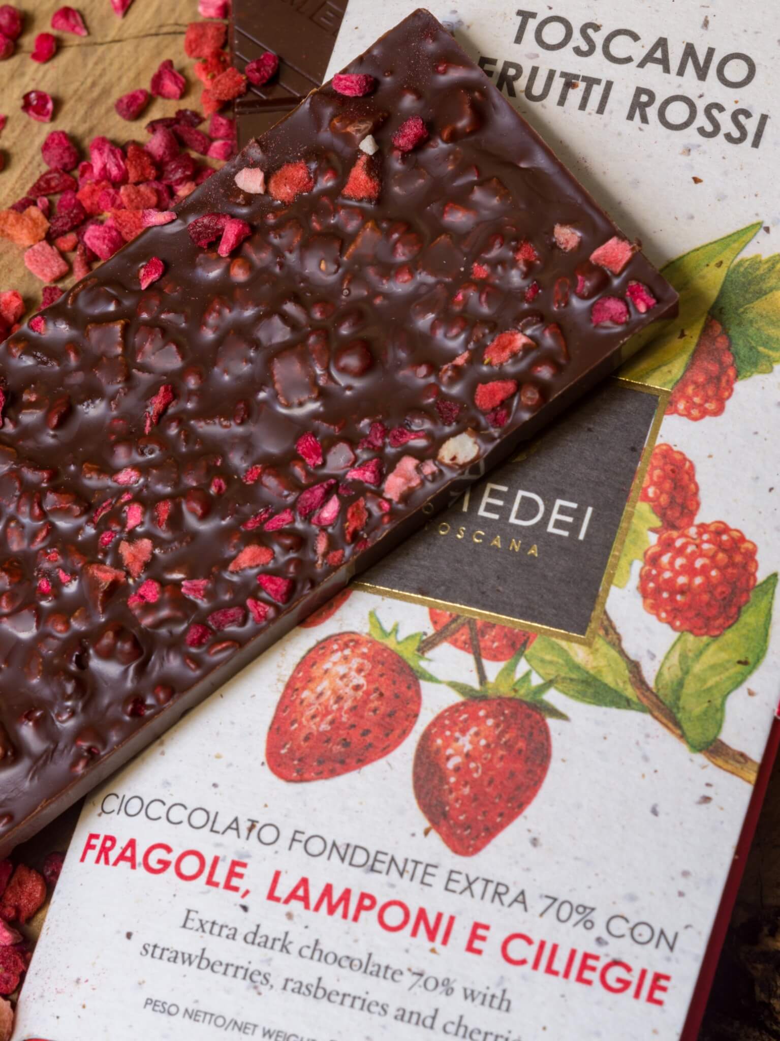 | Ingredients | Cocoa mass, cane sugar, cocoa butter, dried fruit (strawberry, cherry, raspberry) (10%). Cocoa min. 70%. May contain traces of hazelnut, almond, pistachio, walnut, milk. |